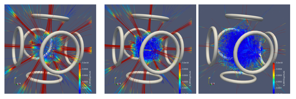 The Polywell concept stems from the research originally pursued by mathematicians from New York University in the 1950s, known as the high-beta cusp reactor. The magnetic cusp is the only known magnetic field configuration where the plasma stability is intrinsically assured due to favorable magnetic field curvature, a key advantage for small and economical fusion reactors. One of the best-known examples of a magnetic cusp is the Earth’s magnetosphere, where the solar wind plasma is blocked from hitting the Earth's surface. Bussard described the key feature of the high-beta cusp as “wiffle-ball” confinement, where high plasma pressure and associated plasma diamagnetism pushes the quasi-spherical magnetic fields outward and shrinks the holes along the seams of the Polywell cusps. See the illustration below showing the topological change in magnetic field structure in the presence of high-pressure plasma. This change in magnetic field structure leads to improved plasma confinement of the high-beta cusp or the WB.