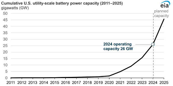 On the positive side, it is estimated that an additional 19.6 GW will be added in 2025, increasing the total grid-scale battery storage in the U.S. to 45.6 GW, which will be roughly 3.7% of the total power generation capacity in the U.S.. This is expected to grow to over 65GW by the end of 2026. And by 2030, this capacity is projected to reach 150 GW (roughly 10% of the total U.S. generation capacity). This capacity increase will be led by the California ISO and Texas’s ERCOT, both of which are expected to exceed 40GW in grid-scale storage capacity. The leading contra-indicator in the U.S. battery storage market is the Trump 2.0 tariffs, which have significantly increased the cost of battery storage projects in the U.S.