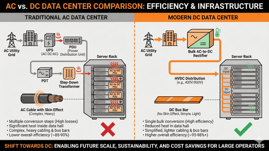 Higher end‑to‑end efficiency – DC architectures remove several AC–DC and DC–AC conversion stages (UPS, PDU transformers, server PSUs), eliminating 7–20% of energy loss in typical AC chains. Lab and field demos show 10–20% total facility energy savings when DC is adopted broadly in distribution.